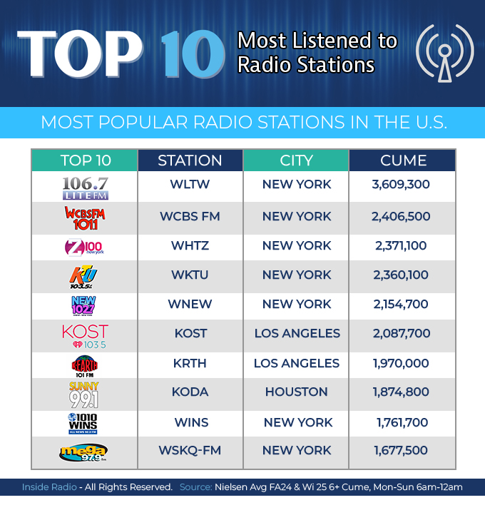 La primera posición de este conteo fue para la emisora de habla inglesa Lite 106.7 FM Nueva York (WLTW-FM), la cual tuvo una audiencia acumulada de 3,609,300 personas. En segunda posición nos encontramos con WCBS 101.1 FM Nueva York (WCBS-FM), con un cume de 2,406,500 personas. Mientras tanto, el tercer peldaño fue para Z100 100.3 FM Nueva York (WHTZ-FM), con una audiencia acumulada de 2,371,100 personas.