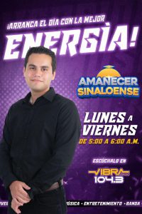 Sintoniza a Edgar Escalante a través de streaming en www.vibraradio.mx, o si preferies a través de Vibra Radio en Los Mochis 104.3 FM, donde está al aire de lunes a viernes de 5:00 a 6:00 de la mañana, y los sábados de 9:00 a 10:00 de la mañana, acompañando a la audiencia con un estilo cercano y dinámico desde las primeras horas del día.